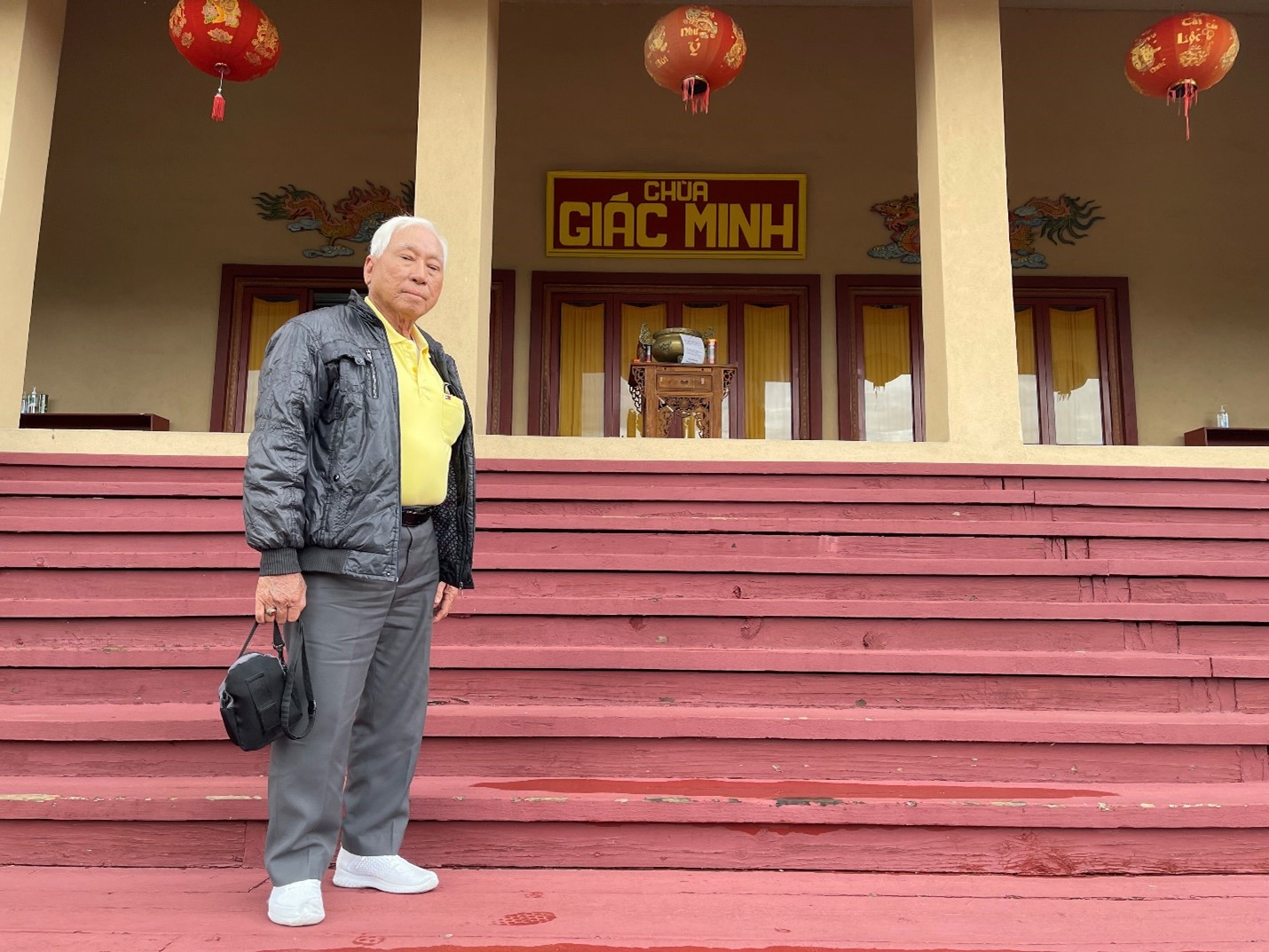 Thiện Linh Đặng Văn Nữu đứng trên bậc cấp trước Chùa Giác MinhRồi Tham quan Cựu Kim Sơn (San Francisco). Đương nhiên là có chụp tấm ảnh kỷ niệm tại cây cầu danh tiếng của nước Mỹ, Golden Gate.