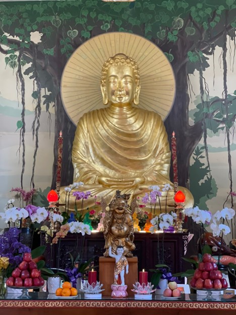 Tượng Đức Bổn Sư trong Chánh Điện Chùa Giác Minh tại East Palo Alto, California. Lúc Trưởng Nữu đến viếng Chùa.