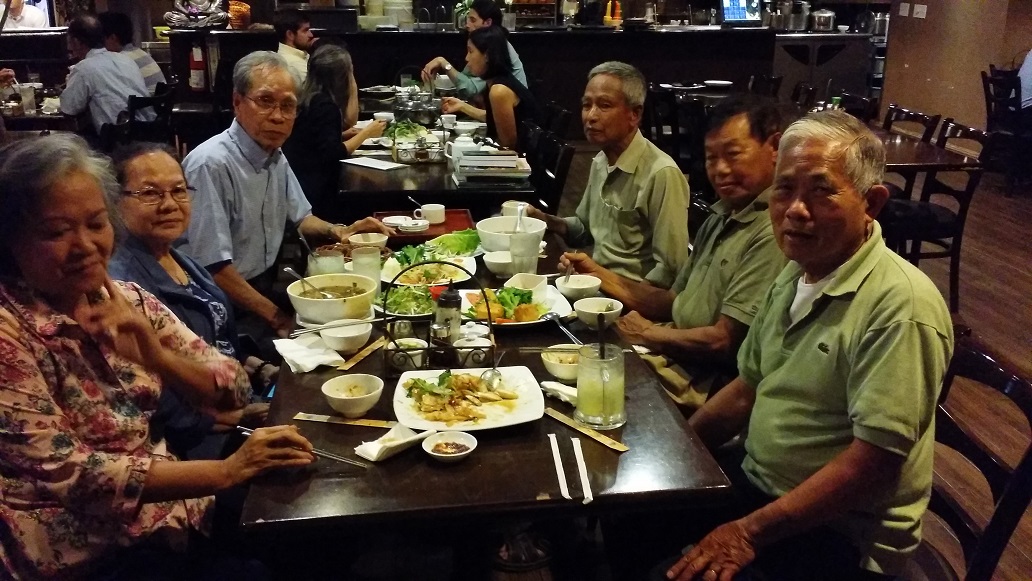 Phạm Minh Tâm biết tôi đến Santa Ana, mời chúng tôi đi ăn bữa tối ở Tịnh Tâm Trai với anh Tuệ Linh và anh chị Đặng Trần Hoa, nhớ tới năm ngoái Hải Đoàn đă tổ chức họp mặt anh chị em NTT-PĐP tại đây, năm nay tôi không muốn làm phiền Hải và Hà Hán Quyền, nên tôi không báo cho các em biết tôi có mặt ở Santa Ana, mặc dù tôi muốn xuống San Diego, ngoài việc thăm Hải, Quyền, Lắm, Thùy Hương c̣n thăm anh chị Trần Ngọc Lạc - Hồng Loan, bạn của nhà tôi cô Loan và anh Tạo. Hẹn lại lần sau vậy.