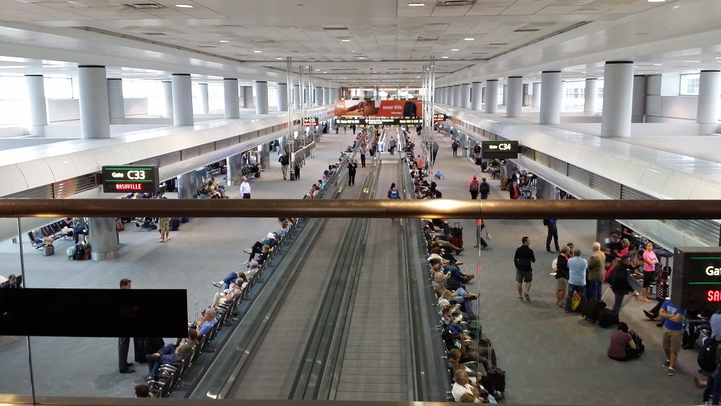 Sáng Thứ Hai 29-8-2016, anh Tuệ Linh đến đưa tôi ra phi trường vào lúc 9 giờ sáng, sau khi anh đă đưa các cháu tới trường học. Từ phi trường Johnway tại Orange County, chúng tôi chuyển máy bay ở phi trường Denver thuộc tiểu bang Colorado, phi trường nầy có một tầng gác lửng với hai hàng ghế để cho khách ngồi khi ở tầng trệt không c̣n chỗ ngồi, nơi đây nh́n xuống tầng trệt du khách dập d́u đi lại.