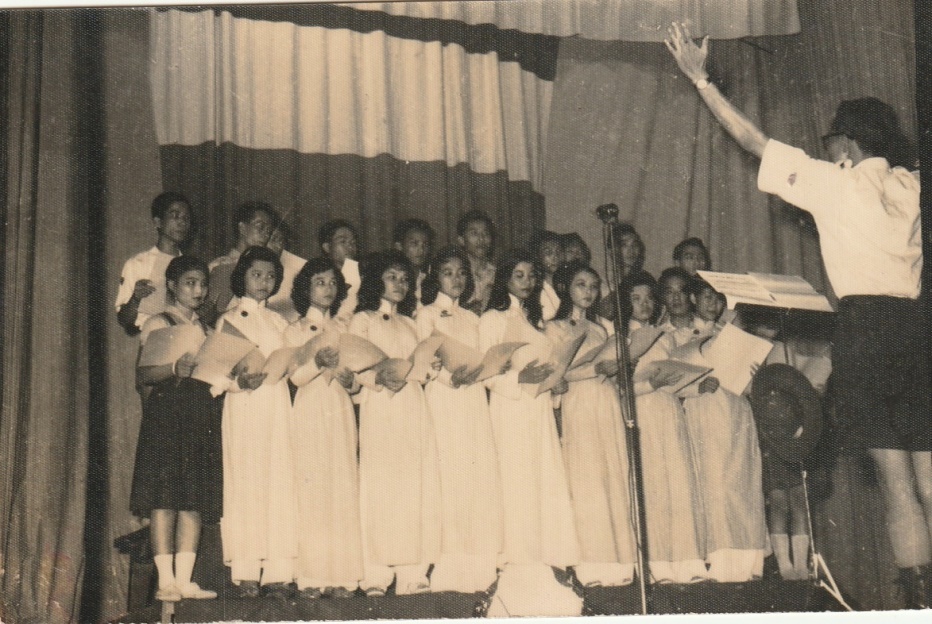 Nhạc sĩ Tâm Hòa Ngô mạnh Thu đang điều khiển Ban Hợp CaGia Đình Giác Hoa, các em Nữ Oanh Vũ có vũ khúc dâng hoa để mừng kỷ niệm Phật Đản.