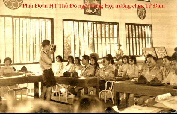 Chánh điện chùa Từ ĐàmSau khi lễ Phật, Phái đoàn được Anh Nguyễn Khắc Từ hướng dẫn vào Hội Trường chùa Từ Đàm, nơi đây đang có Đại Hội Huynh Trưởng Gia Đ́nh Phật Tử Trung Phần, Đại Hội họp theo h́nh chữ O, Phái đoàn vào ngồi vị trí nh́n thẳng vào chủ tọa đoàn, sau lưng là cửa chính ra vào.