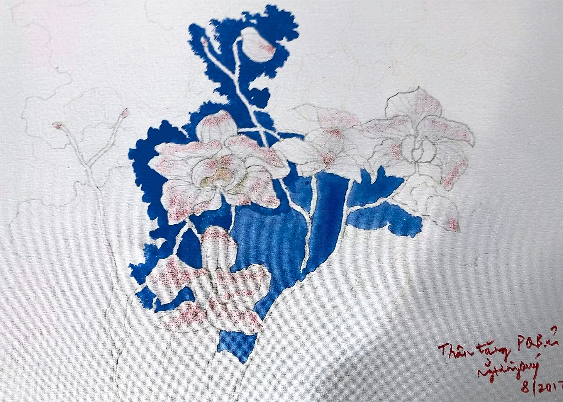 Nhìn vẩn vơ quanh, tôi thấy ở góc phòng có một cái giá vẽ, trên ấy sẵn để một khung vải. Xa mấy thước không nhìn rõ, tôi đứng dậy tiến lại gần: Hóa ra bức vẽ lan chỉ được phác họa bằng bút chì, mấy cánh lan mới thoáng có một nước màu hơi phớt đỏ - vàng lấm chấm, ở giữa nhiều khoảng trống mầu xanh da trời đậm - nhạt thô sơ; còn những cọng hoa và cả nền bức họa vẫn thấp thoáng nét chì, chỗ rõ chỗ mờ...Không hiểu sao mà tôi lại tự nhiên buột miệng thốt lên: