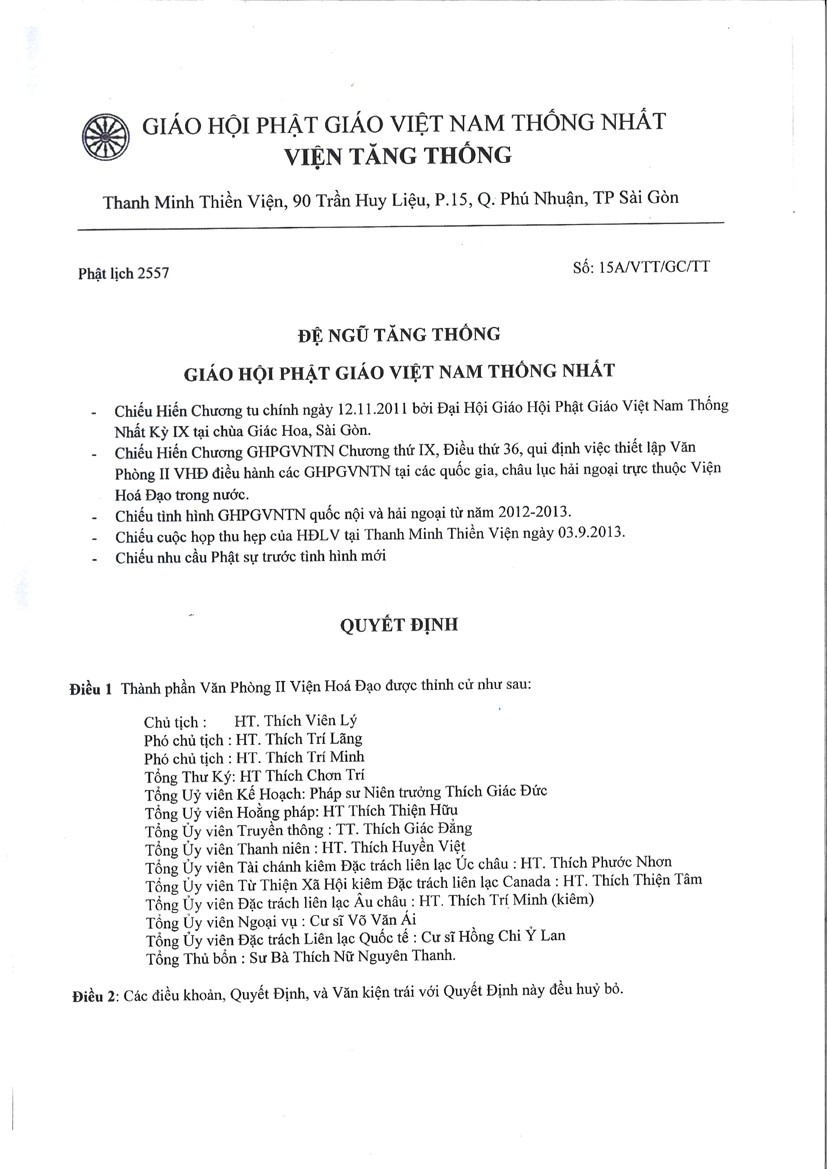 Trước sự chấn động và thỉnh cầu của chư Tăng Ni và đồng bào các giới trong và ngoài nước, Đức Tăng Thống Thích Quảng Độ chấp nhận tiếp tục lănh đạo Giáo hội - Quyết định thành phần nhân sự Văn pḥng II Viện Hóa Đạo do Đức Tăng Thống ban hành