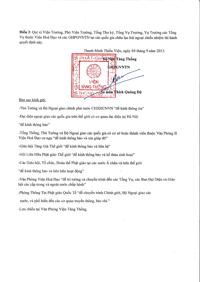 Viện Tăng Thống Ban hành Quyết định 15A/VTT/GC/TT ngày 04-9-2013