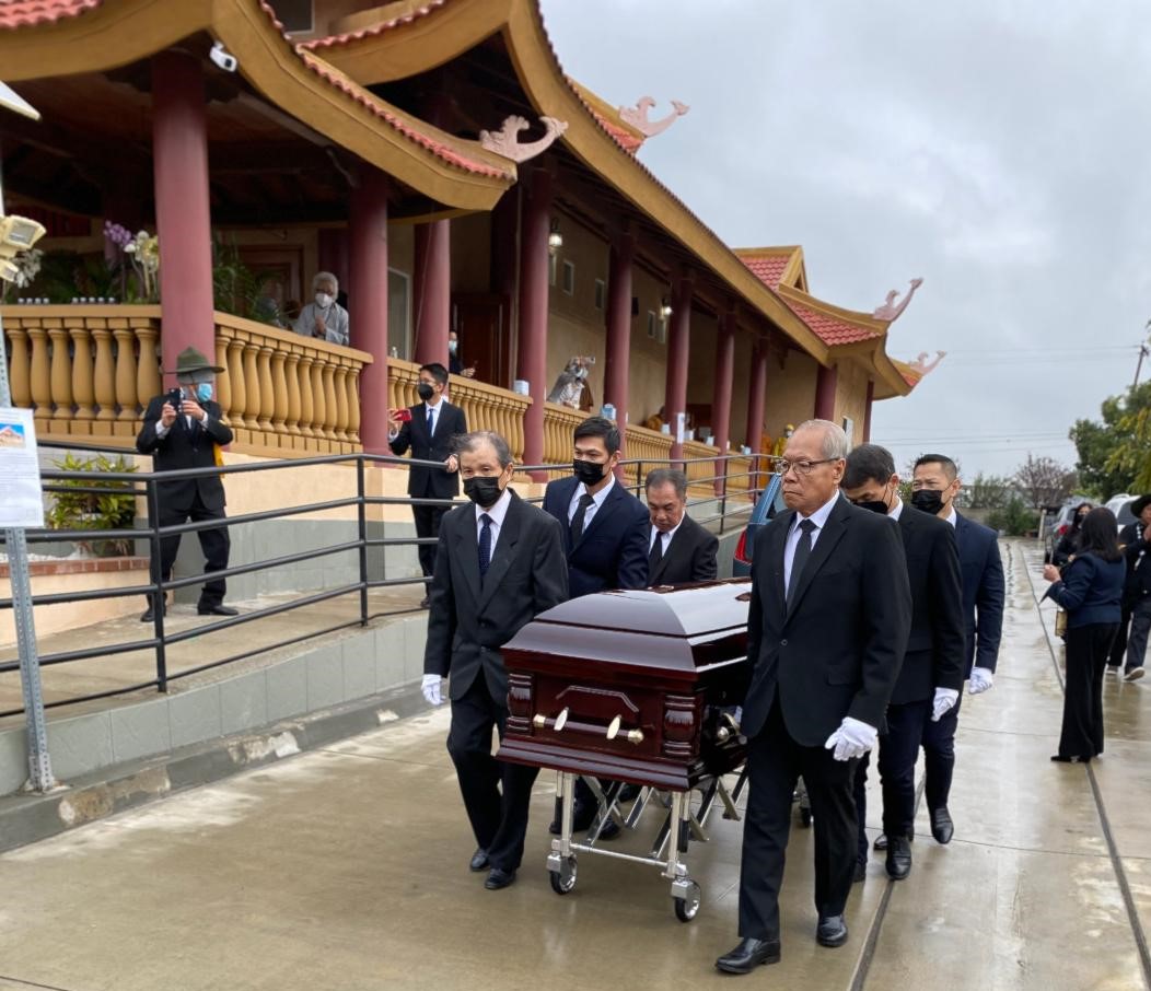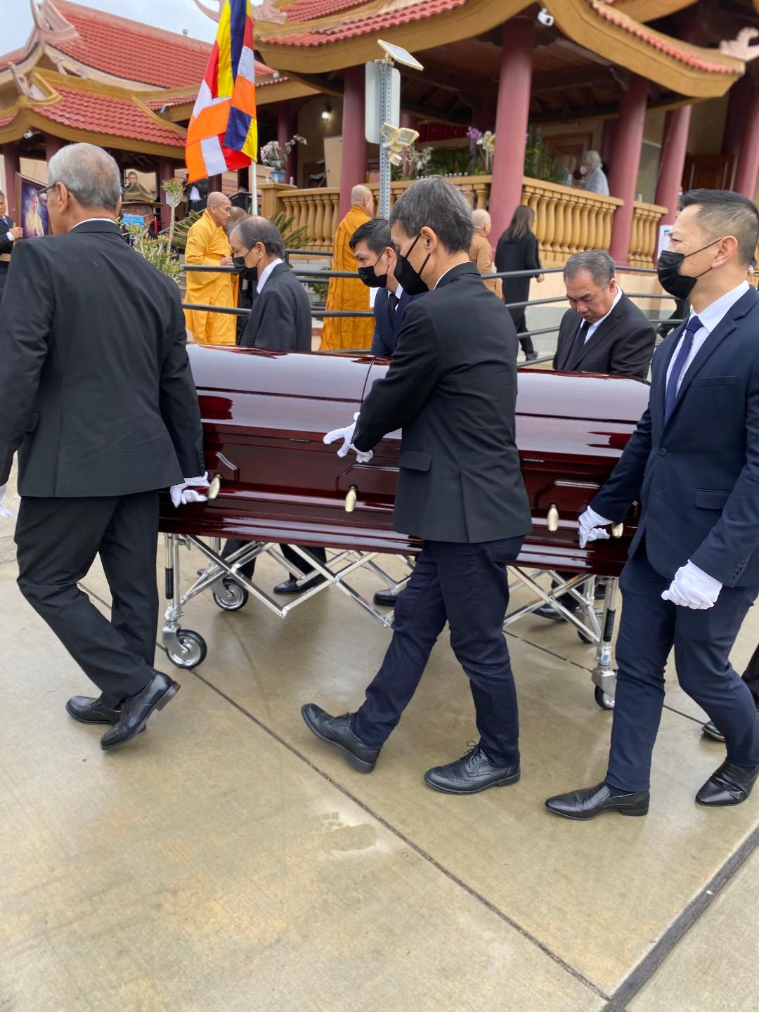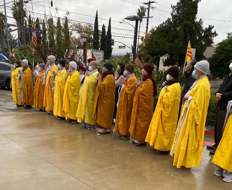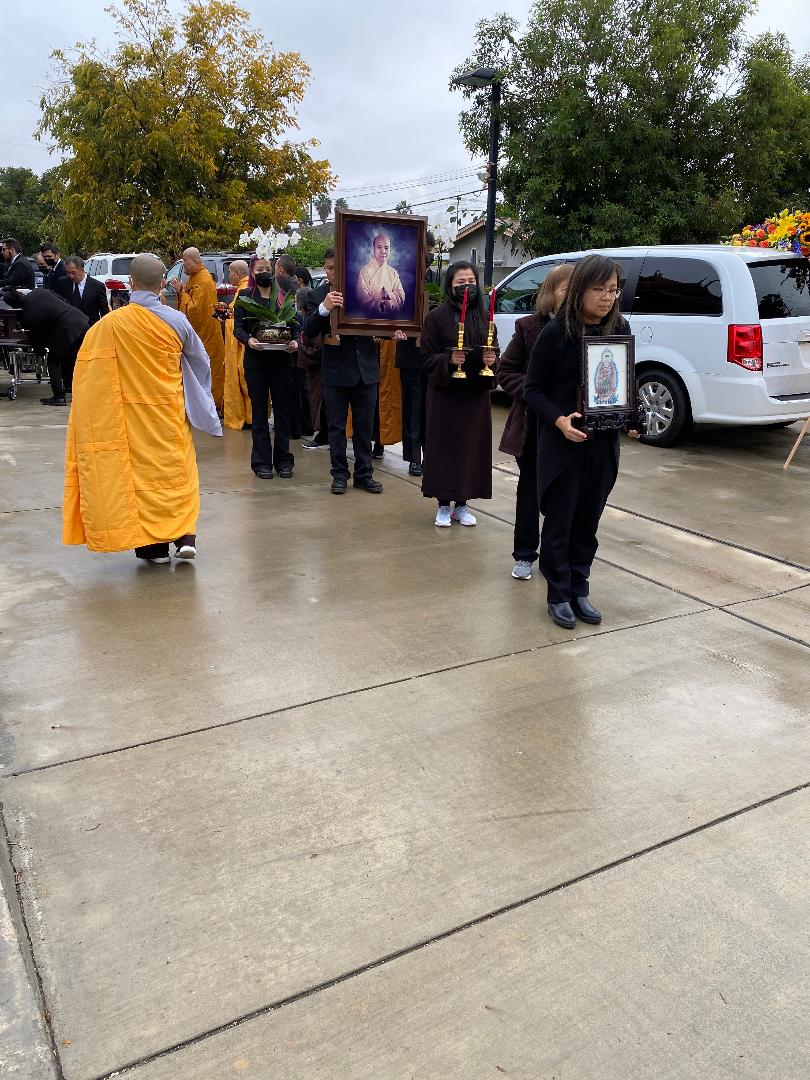 Minh Châu rời nhà từ lúc tờ mờ sáng ( 6:30), cả thành phố Simi Valley vẫn đang mưa và còn chìm trong bóng đêm; Cây quạt nước làm việc hết tốc lực mà MC chỉ chạy được 40miles/giờ. Vừa lái xe MC vừa cầu xin trời ngừng mưa để Tang Lễ của Hòa Thương được trang trọng. Tìm được chỗ đậu xe thì vừa 8 giờ đúng. Khăn quàng, áo ấm trùm ngoài bộ đồng phục GĐPT, MC bước ra ngoài. Tuy trời vừa mưa, vừa rét nhưng anh Đăng Trần Hoa và anh Tuệ Linh đã đứng ngoài sân, sẵn sàng chu toàn nhiệm vụ Sư Già giao phó ( Trật Tự và Tiếp Tân). Anh Hoa hướng dẫn MC vào bếp uống cà phê, anh Tuệ Linh hướng dẫn MC tìm Ban Tổ Chức để nhận khăn tang. Đứng 8:45 AM, xe nhà quàn đưa Kim Quan thầy về đến chùa, mấy anh em vội vàng vào hàng, chuẩn bị đón nhục thể của Sư Cụ Viện Chủ Chùa Vĩnh Nghiêm.
