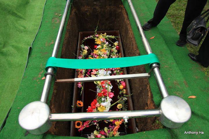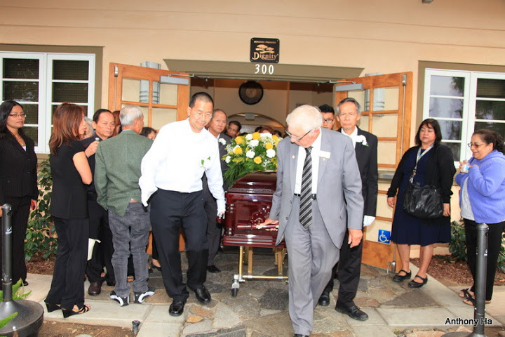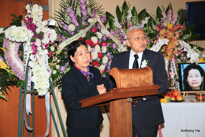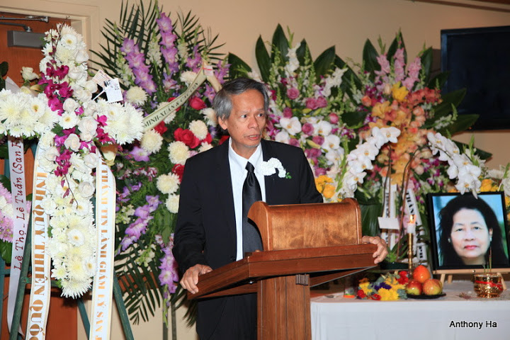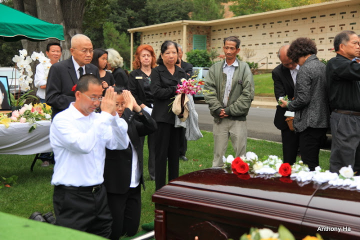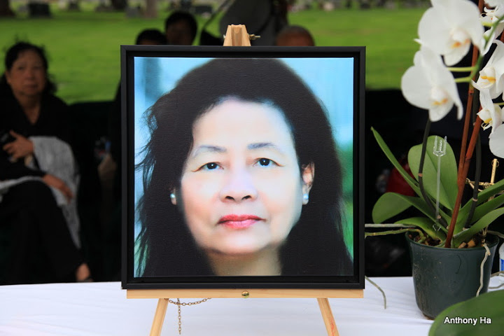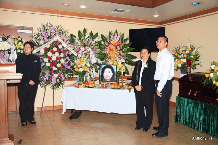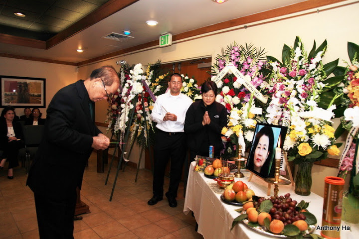 được an táng ngày 10 tháng 10 năm 2015 tại nghĩa trang Oak Hill, San Jose.Trong lúc tang gia bối rối, tôi vấp phạm nhiều sơ sót, kính xin Quư Vị tha thứ.Bắt đầu từ tuần trước tôi cúng thất cho nhà tôi tại chùa Giác Minh cho đến hạ tuần tháng 11, 2015.