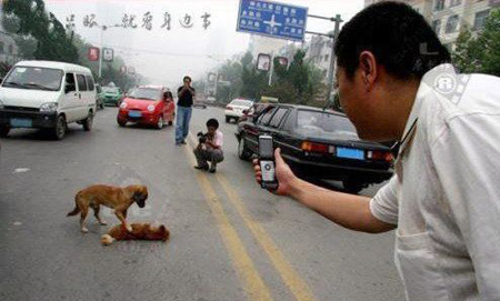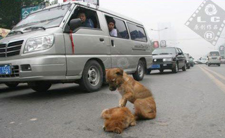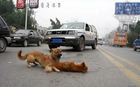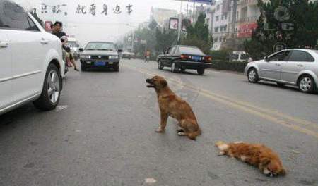 Con chó bị xe đâm nằm bẹp giữa đường. Một con khác trông rất buồn thảm, dùng mõm và chân lay liên tục mong bạn nó hồi tỉnh. Sau đó, nó chạy quanh ngỏng cổ lên cầu khẩn người qua đường giúp đỡ. Hình ảnh thương tâm này đã được đăng lên nhiều trang Trung Quốc, khiến cư dân mạng chạnh lòng.