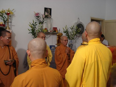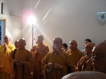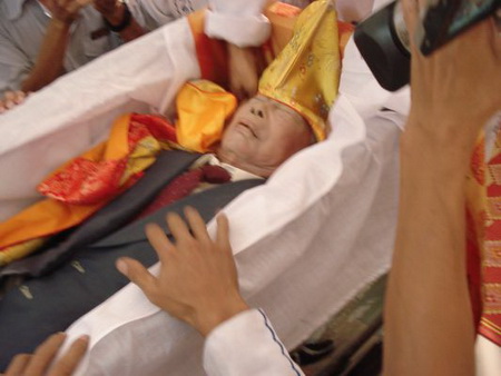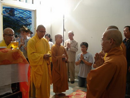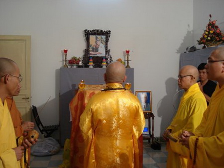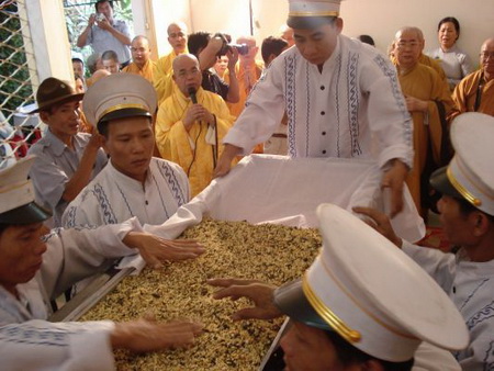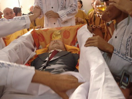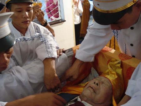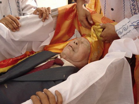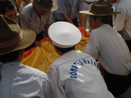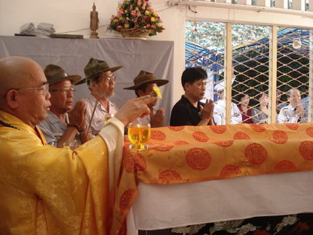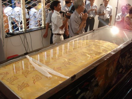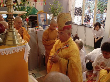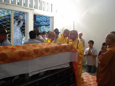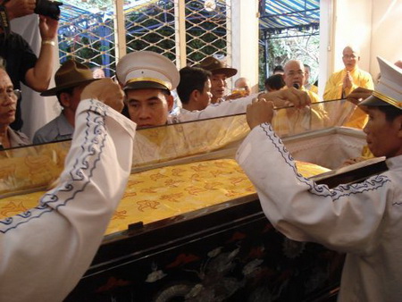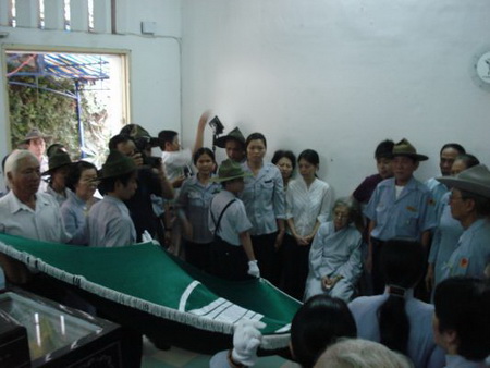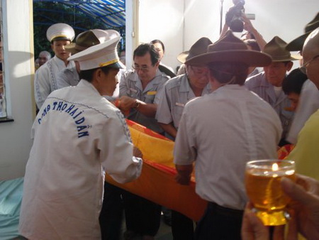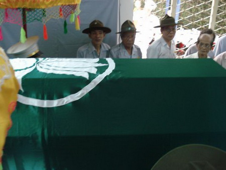 Sáu cấp Đoàn viên Gia Đình Phật Tử phủ trên áo quan sơn mài lá đại kỳ Gia Đình Phật Tử Việt Nam